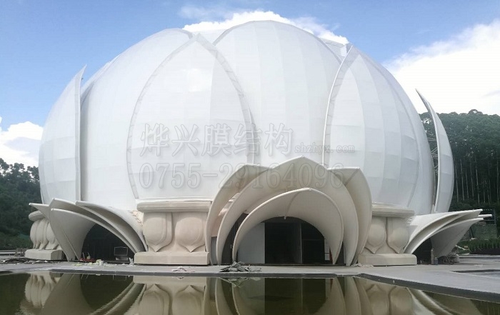 工程情況:燁興-云浮蓮花PTFE膜結(jié)構(gòu)是可作360度自由旋轉(zhuǎn)的大型蓮花劇場舞臺,由10個近千平方米的大花瓣和10個小花瓣圍成的花朵在需要時可進(jìn)行展開或閉合操作,花瓣外膜全部采用進(jìn)口PTFE膜結(jié)構(gòu)制成,內(nèi)襯則采用PTFE網(wǎng)格膜,膜結(jié)構(gòu)工程總量11280平方米。