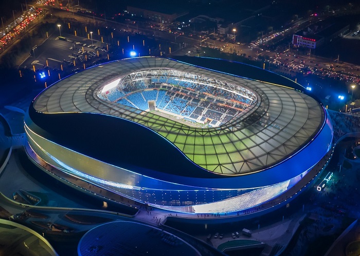 燁興公司作為青春足球場的ETFE膜結(jié)構(gòu)供應(yīng)商,負責(zé)膜結(jié)構(gòu)分項的深化設(shè)計、材料配套及施工安裝。“追求經(jīng)典工程品質(zhì)”是我們長久堅持的理念之一,做項目先嚴謹論證再精細化施工,在燁興人的不懈奮斗下,青春足球場的建成建筑效果遠比設(shè)計渲染圖好看,建成即成青島新地標(biāo)!