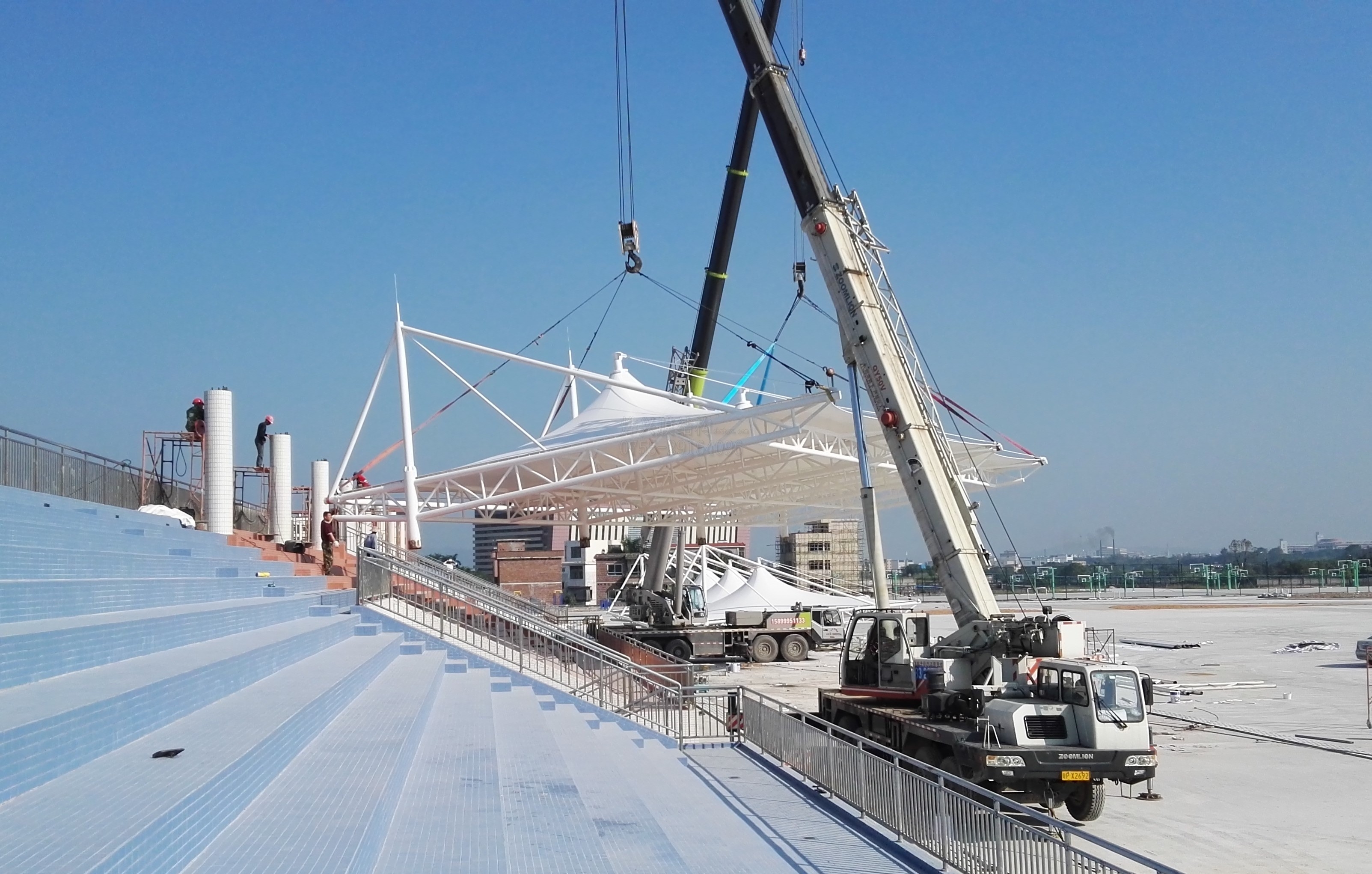 燁興提示:廣州機電學校膜結(jié)構(gòu)看臺,經(jīng)過前期的一系列準備工作,今天已經(jīng)到達最關(guān)鍵的吊裝階段。本文就現(xiàn)場施工情況進行一個簡單播報,一起去看看吧。