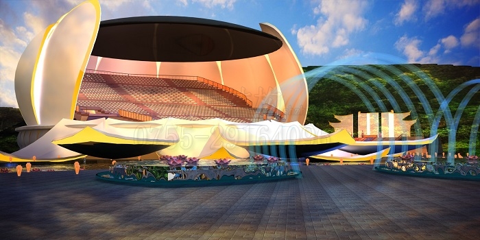 燁興云浮蓮花景觀型膜結(jié)構(gòu)舞臺是一個非常獨(dú)特巧妙的轉(zhuǎn)動式舞臺建筑,全部采用鋼模結(jié)構(gòu)制作。這個機(jī)械式舞臺造型取自在佛教寓意深遠(yuǎn)的蓮花,為了營造與眾不同的觀賞效果,這朵巨型蓮花舞臺表演過程中會緩慢轉(zhuǎn)動,蓮花的花瓣也會隨著場景需要進(jìn)行開合操作??梢韵胂笠幌?,觀眾在一朵“活的”蓮花里欣賞節(jié)目表演,會得到怎樣的奇妙體驗(yàn)。