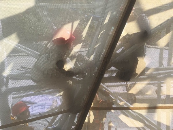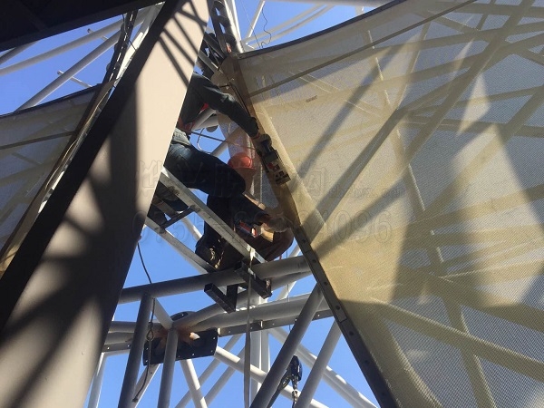 現(xiàn)場(chǎng)工人正在對(duì)安裝的膜材進(jìn)行細(xì)節(jié)處理