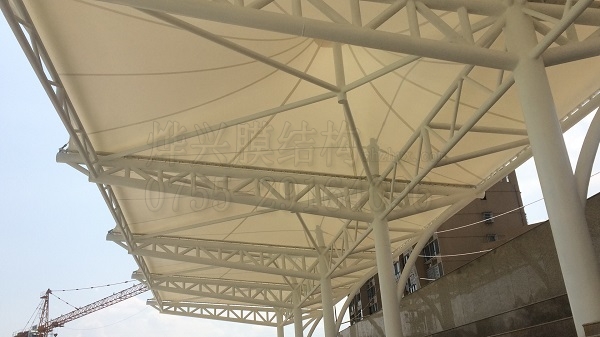 此次福建漳平一中看臺膜結(jié)構(gòu)項目,工程面積826平方米,是典型的管桁架鋼膜結(jié)構(gòu),主要鋼構(gòu)全部在鋼鐵加工廠進行下料加工成型,然后再運到現(xiàn)場進行吊裝焊接作業(yè),鋼結(jié)設(shè)計年限為50年;膜材方面,全部采用進口PVDF白色膜材,質(zhì)保15年。從工人進場作業(yè)到項目通過驗收,共用時40天。