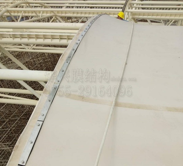 膜材與鋼索可以單邊或雙邊連接。簡(jiǎn)單的連接方法是將鋼索穿入熱合好的膜套中。對(duì)重要工程,可采用鋁合金或不銹鋼夾板和連接件來(lái)連接膜材與鋼索。