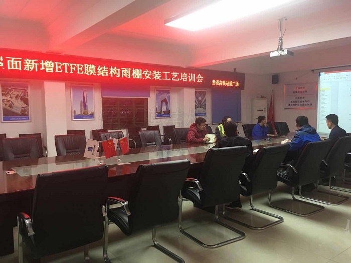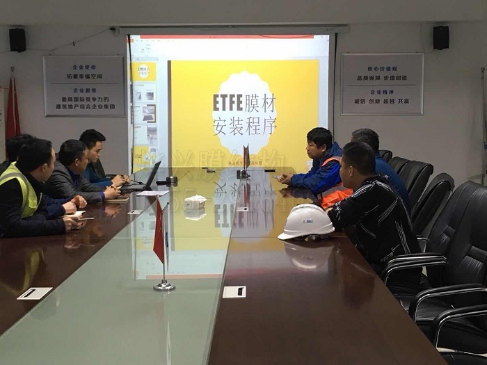 3月6日,中建三局舉辦ETFE膜結(jié)構(gòu)雨棚安裝專項會議,再次對吊裝方案進行討論補充,并最終通過方案。
